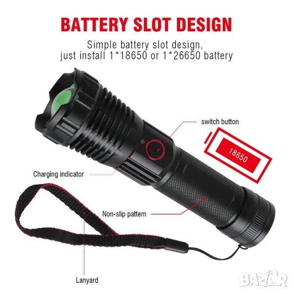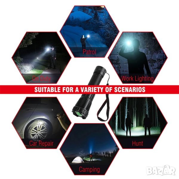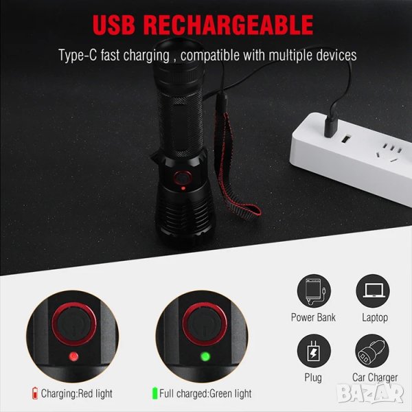 Мощно фенерче с интензитет на светлината от 4000 лумена. С тегло само от 200 грама. Фенерът притежава ефект за мащабиране (ZOOM), който позволява да разширявате или намалявате светлинния лъч и може да достигне оветяване на разстояние до 200 метра. В комплекта влиза акумулаторна батерия и може да го зареждате със стандартен USB Type-C кабел. Водоустойчив, LED фенерът е изключително подходящ за къпинг, туризъм, лов, колоездене и др.