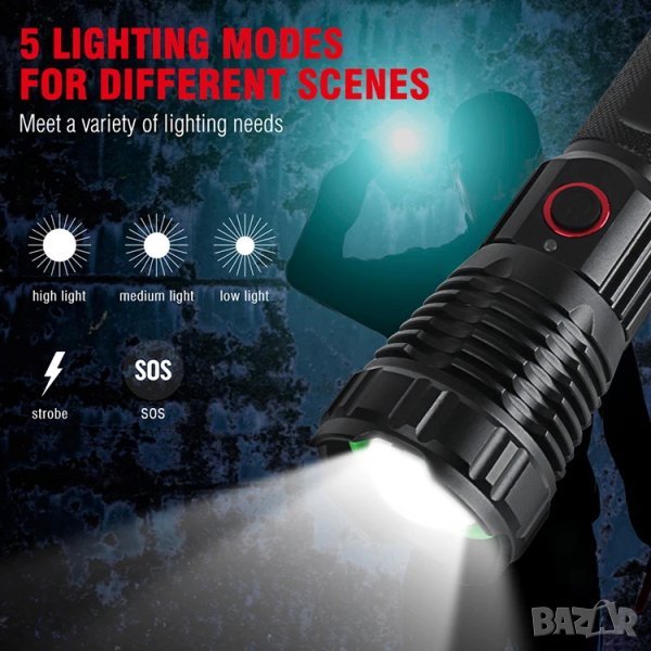 - Режим на работа: Висок--Среден--Нисък--Стробоскоп--SOS