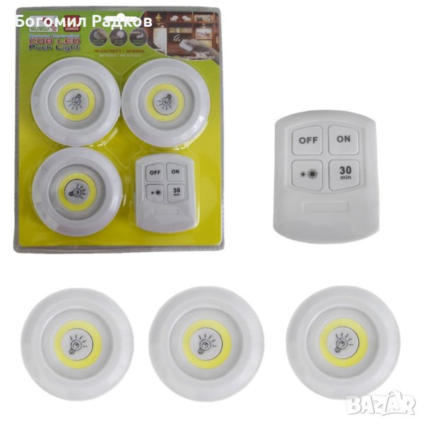 Предлагаме Ви пълен комплект от три осветителни тела за Вашия дом. Можете да изберете дали да ги включите ръчно, или да използвате функционалността на дистанционното и да ги командвате на разстояние от три метра. Освен включване и спиране, можете да контолирате и двете нива на яркост. Нагласете таймера за автоматично изключване след 30 минути, ако смятате че после светлините няма да са Ви нужни. Не се притеснявайте, че ще загубите контролера, тъй като производителите са помислили и за това. В комплекта има и стилна поставка за дистанционното, което ще придаде на дома Ви изискан стил. Лампичките са изработени от устойчива пластмаса и светят с ярка COB LED светлина. Инсталацията на всичко е изключително лесна, благодарение на двойнозалепящите се лепенки и стандартните батерии, които се ползват.