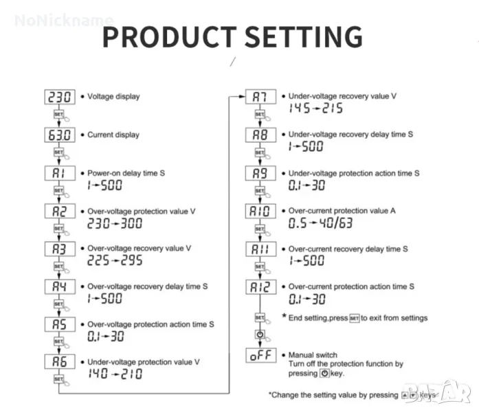 • Време за забавяне на възстановяването при свръхток: 1s ~ 500s (по подразбиране: 30s)