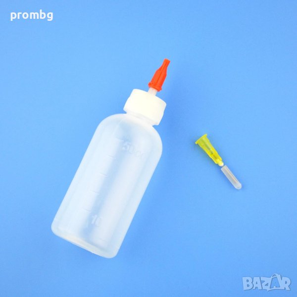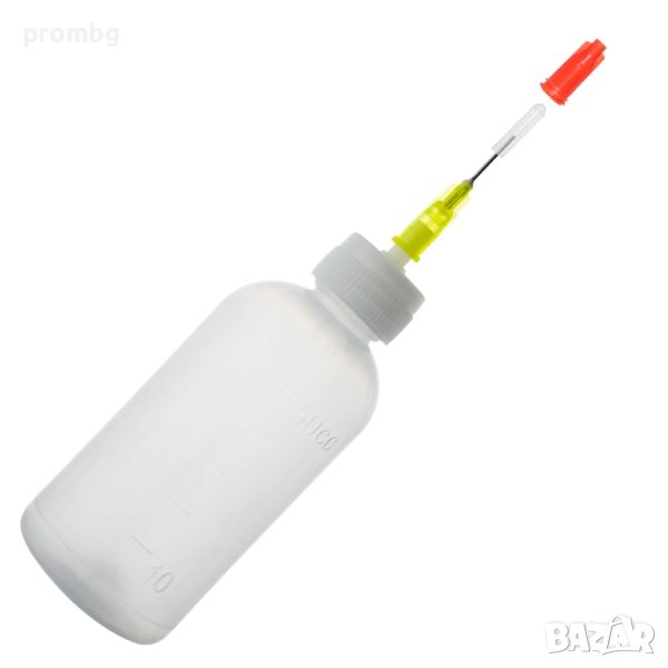 контейнер с дозатор 50 мл, бутилка с апликатор и дозираща игла, игли. Комплектът включва: 1бр. пластмасова бутилка 50 мл, 1 бр. дозираща игла (20G 0,5 инча), 1 бр. капачка за дозиращата бутилка, 1 бр. капачка за дозиращата игла. Бутилката е разграфена за измерване и дозиране на течности. Капачката може да се използва без игла за постигане на максимален поток. Подходящо за мастило, лубриканти, лепило, къна, боя, багрила за коприна и др. Размер на бутилката: 9,5 см (без игла) х 3,5 см.