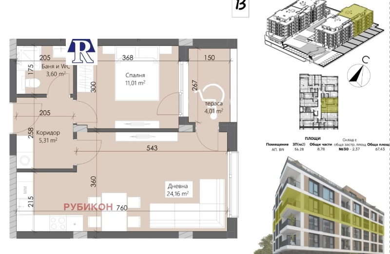Разпределението на апартамента е както следва: дневна с кухненски бокс(24.16кв.м), спалня(11.01кв.м.), баня с тоалетна(3.60кв.м), антре(5.31кв.м), тераса(4.01кв.м), и склад(2.37кв.м.). Застроена площ(56.28кв.м.). Общи части(8.78кв.м.). Общо площ (67.43кв.м.). Изложение - Изток! Към жилището имате възможност да закупите и паркомясто надземно или подземно, които се заплащат допълнително.