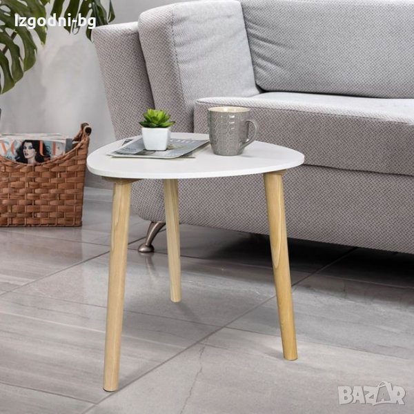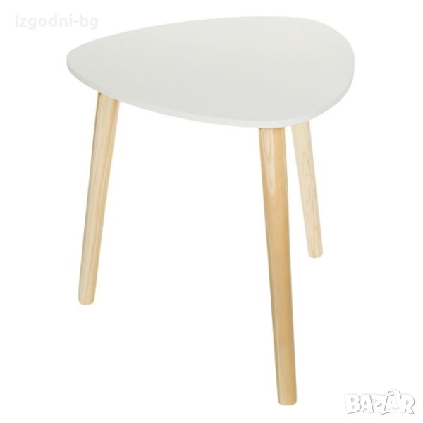 Бяла помощна маса с триъгълна форма със заоблени ръбове и 3 крака, в естествен светъл цвят.