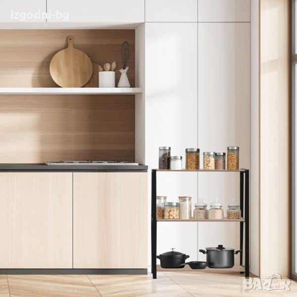 Подова етажерка от масивно дърво с 3 рафта и размери 65 х 29 х 78см. Рамката е черна, а рафтовете са в естествен дървесен цвят. Идеален е за баня, кухня, хол, трапезария, спалня или офис.