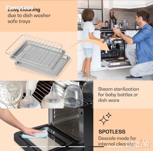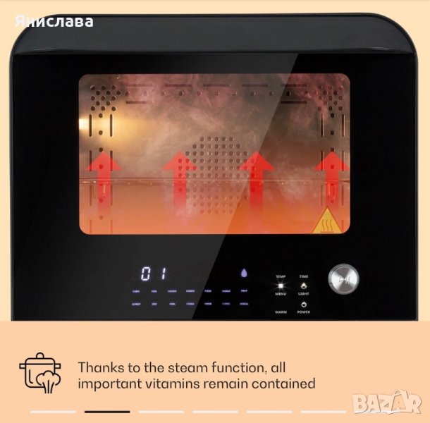 Пържени картофи, риба, пилешко месо, шишчета, пица, зеленчуци, супа, нискотемпературно готвене на пара, високотемпературно готвене на пара, режим грил и печене, режим сушене, стерилизация, размразяване, отстраняване на котлен камък