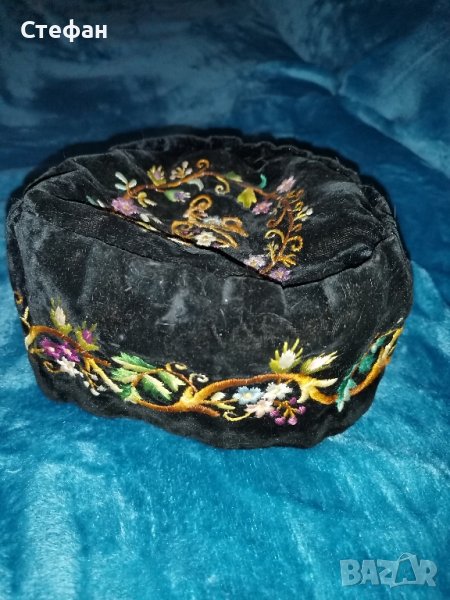Шапката е с дължина в основата 28см.Изработена е ръчно от черно,гладко кадифе ,което е бродирано ръчно.Много е красива.Купих я преди доста време от Копривщица.