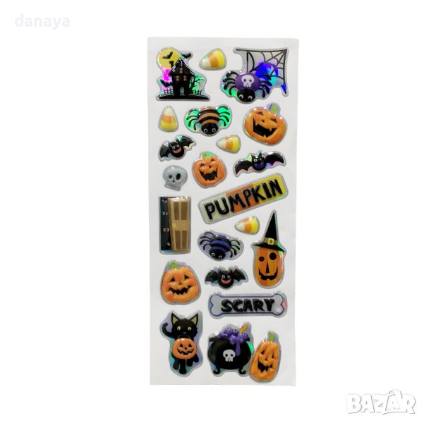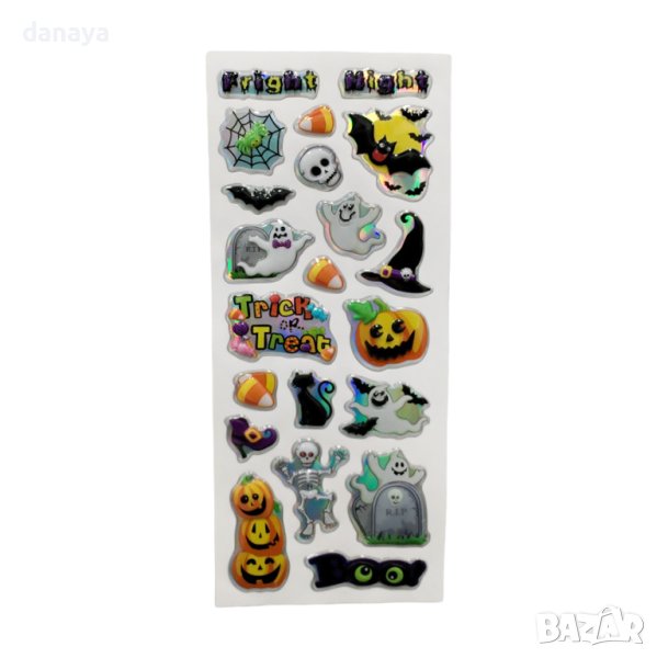 Комплект страховити и забавни Halloween стикери за декорация и украса на различни предмети. Направете своята страховита украса за Хелоуин в дома си и организирайте наистина страхотно парти! Декоративните самозалепващи се стикери ще се впишат идеално във вашия декор. Изработени са от пластмасово фолио.