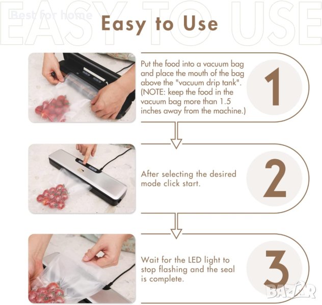 [Лесен за използване и съхранение] Нашата автоматична вакуумна машина за запечатване разполага с операция за запечатване с един бутон и LED индикатори за показване на състоянието на операцията. Неговият компактен и лек дизайн го прави лесен за използване и съхранение в шкафове и чекмеджета.