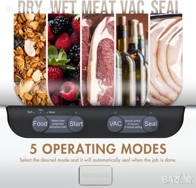 [Настройки 5 в 1 за многостранна употреба] Нашата машина за вакуумно запечатване е идеална за месо, морски дарове, плодове, зеленчуци, ядки и хляб. Изберете между сухи, влажни, месни и ръчни режими, за да отговарят на вашите нужди за съхранение на храна.