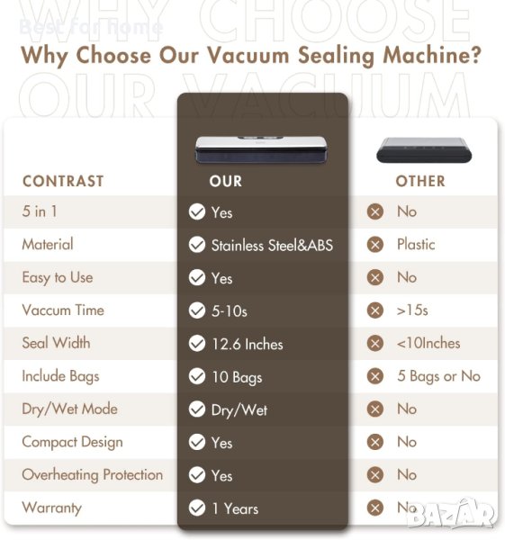 [Безопасна и издръжлива] Нашата машина за вакуумно запечатване за спестяване на храна разполага с механизъм с двойно заключване и защита от прегряване, за да се гарантира безопасна работа. Разширеният нагревателен проводник елиминира риска от изтичане на въздух. Отговаря на приложимите стандарти за изпитване за безопасност на продукта и е създаден да издържи.