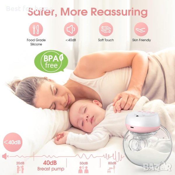 Без BPA, безопасен за хранителни цели силикон: мек, щадящ кожата и без BPA, за да защити здравето на всяка майка и бебе. Моторът е специално проектиран за тиха работа, което ви улеснява да дискретно помпате, без да се притеснявате, че ще събудите бебето си. Ниското ниво на шум гарантира, че вашето помпане ще бъде спокойно и непрекъснато