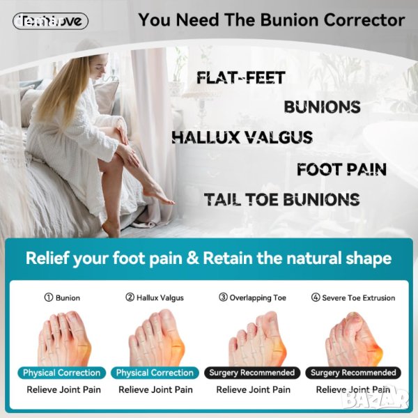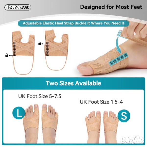 Коректорните чорапи за буниони Tech Love предлагат научно решение за дискомфорта на бунионите чрез използване на балансиран метод на сцепление. Тези чорапи нежно раздалечават големите и опашните пръсти, като осигуряват удобно отделяне на пръстите и спомагат за поддържане на естествената форма на крака. Техният дизайн е полезен както за бунион, така и за релеф на бунионет. Изработени от тънък плат с дебелина 1 mm, тези коригиращи чорапи могат да се носят удобно както през деня, така и през нощта, като пасват безпроблемно под различни видове обувки, включително спортни обувки, равни обувки, маратонки, сандали и токчета. Материята е мека, дишаща и подобна на модерния материал за бельо, осигуряващ удобно носене без прекомерно изпотяване или свиване на пръстите на краката. Продуктът разполага с регулируема еластична лента за петата за гъвкаво и стабилно прилягане за всички размери, предлага се в малък (UK размери 2,5-4) и голям (UK размери 5-10,5). Чорапите остават сигурно на място, позволявайки свобода на движение и могат да се носят с обувки, на боси крака или докато спите. В допълнение, тези чорапи за корекция на буниони са издръжливи и могат да се перат, като запазват своята дишаемост и еластичност във времето, осигурявайки дълготрайно облекчение при проблеми с краката.