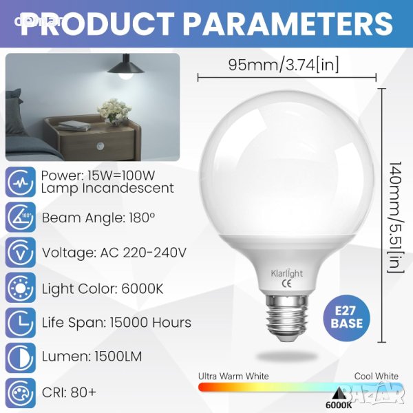 Заменете традиционните 100W крушки с нажежаема жичка с тези 15W G95 крушки, за да спестите до 85% от сметките за енергия и осветление. Те предлагат ярка мощност от 1500 лумена в студена бяла светлина от 6000K, с дълъг живот над 15 000 часа, намалявайки необходимостта от чести смени. Лесни за инсталиране на осветителни тела с винтова основа E27/E26, тези LED крушки са щадящи очите, без трептене, отблясъци, UV или бръмчене, осигурявайки удобна и безопасна осветителна среда. Те могат да се похвалят с висок CRI от 80+, осигурявайки естествени и ярки цветове. Идеални за различни приложения, тези крушки са перфектни за козметични огледала, осветителни тела за баня, настолни лампи, полилеи и други във всекидневни, спални, кухни, офиси и други пространства.
