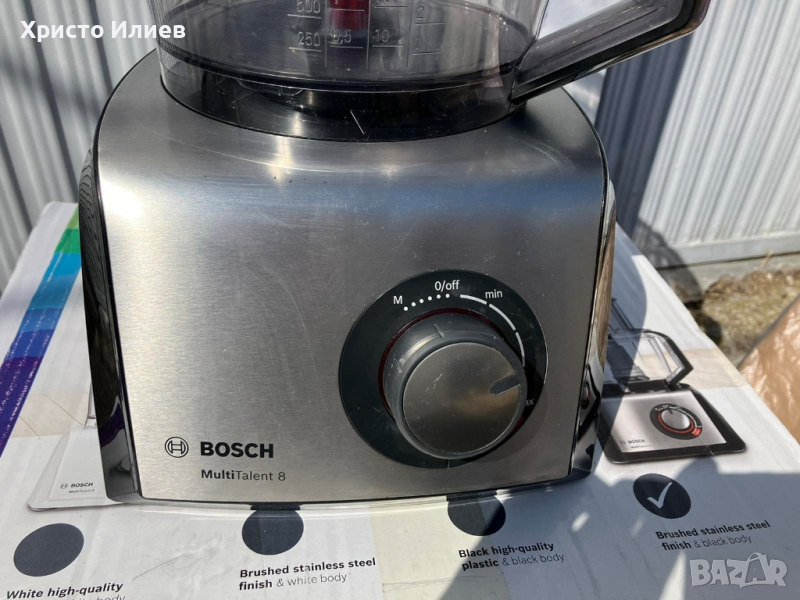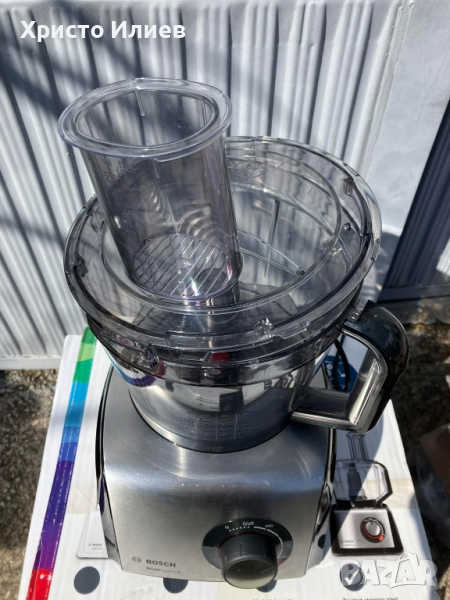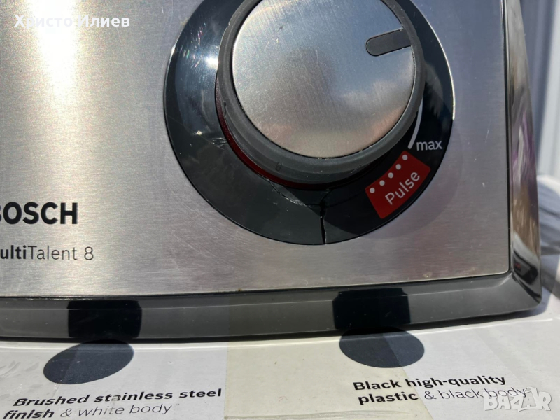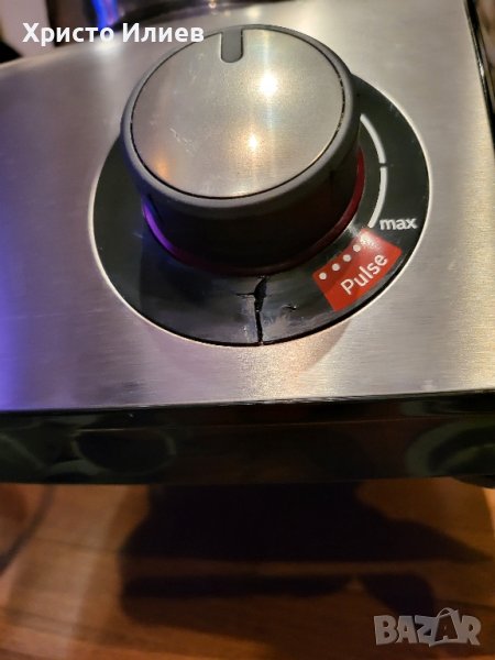 Има лека забележка - леко пукнато под бутона за скоростите. Има приложени реални снимки. Няма други забележки /счупени части. В оригинален кашон. Налични са само купата и каната на блендера. Другите части липсват от робота.