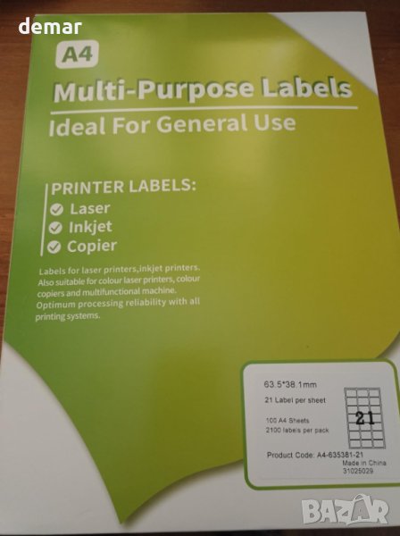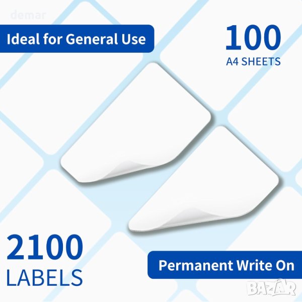 Този пакет от щанцовани самозалепващи етикети A4 предлага 2100 етикета, с размери 63,5 x 38,1 mm всеки, с 21 етикета на лист, осигурявайки издръжливост и силно залепване върху различни повърхности като хартия, пластмаса, стъкло или метал. Проектирани за лесен печат с обикновени принтери и копирни машини, тези етикети опростяват задачите за етикетиране в офиса или дома. Тяхното прецизно щанцоване осигурява лесно отлепване и нанасяне без необходимост от ръчно рязане или подрязване. Тези многофункционални етикети са идеални за редица приложения, включително етикетиране на продукти и адреси, сортиране на документи и етикетиране на рафтове, задоволяване на различни организационни нужди.