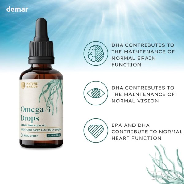 Тази добавка с Омега-3, с препоръчителна доза от 5 ml дневно, доставя 1351 mg DHA, 672 mg EPA и 20 µg веган витамин D3. Съдържа висококачествено натурално масло от омега-3 водорасли, осигуряващо незаменими мастни киселини DHA и EPA, които са от решаващо значение за нормалната функция на мозъка, зрението и здравето на сърцето. Добавянето на витамин D3 подпомага функцията на имунната система. Тези съставки се добиват от устойчиви водорасли, предлагайки вариант на растителна основа. Капсулите осигуряват оптимална бионаличност и са подходящи за вегани/вегетарианци. Произведена в сертифицирани съоръжения в Германия, тази добавка не съдържа химически и изкуствени съставки, което подчертава високото качество и устойчивостта.