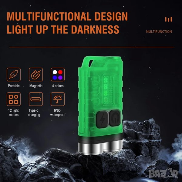 ♥♥12 режима на осветяване и 4 цвята на осветяване - Малкото фенерче тип ключодържател има 5 режима за основна светлина (супер ярка - силна светлина - средна яркост - слаба светлина - икономична), 7 режима на странична светлина ((бяла светлина - UV - червена) светлина - червена светкавица - червена синя светкавица, натиснете продължително, за да включите бялата светлина, щракнете три пъти, за да включите червено-синята светкавица), която може да отговори на вашите различни изисквания.