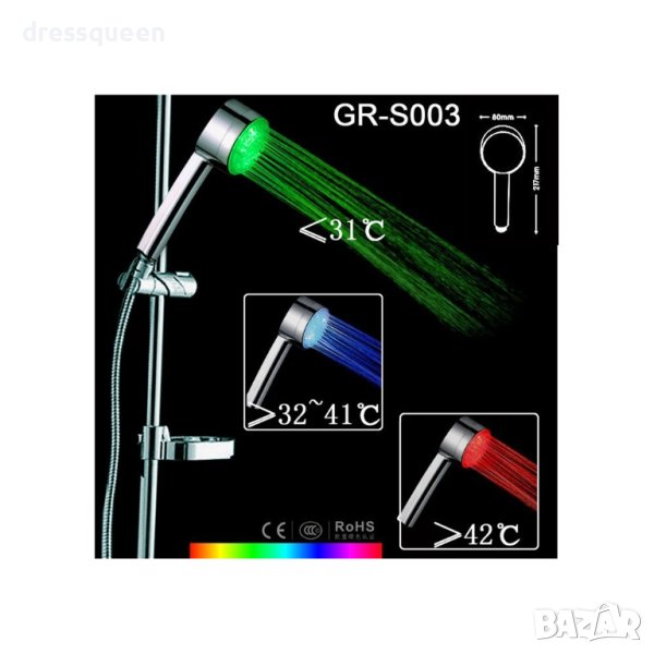 3 цвята на светене: зелен/син/червен (според температурата на водата )