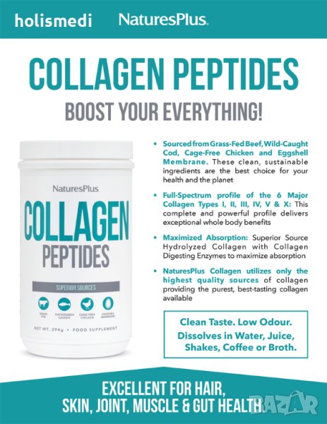 Хидролизираният Колаген на NaturesPlus® е висококачествен натурален колаген, под формата на прах, който е известен също и като Колагенови пептиди. Отличава се с премиум състав.
