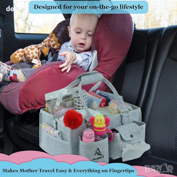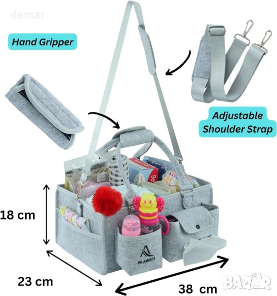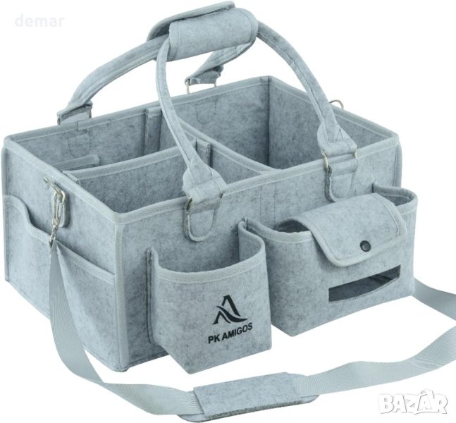 PK AMIGOS All-in-One Nappy Caddy Organizer е универсално и просторно решение за организиране на най-важните неща за бебето с размери 38x26x18 cm. Изработен от висококачествен филц, той разполага с два подвижни разделителя със здраво сиво велкро и седем широки външни джоба, включително специални джобове за бебешки кърпички и хранилки. Това улеснява достъпа до най-важните неща за новороденото, дори по време на хранене късно вечер. Вътрешен мрежест джоб е идеален за безопасно съхранение на снимката или здравните карти на вашето бебе. Ръбовете на органайзера, включително дръжките, разделителите и джобовете, са защитени със сива лента, за да се предотврати натрупването на прах и протриването, като по този начин се удължава живота му. Уникалните характеристики включват подвижна ръкохватка за чиста, удобна и безхлъзгаща работа и подвижна, регулируема дълга презрамка за носене без ръце - идеална за родители, изпълняващи няколко задачи едновременно. Този преносим кеди предлага отделни вътрешни и външни секции, което го прави удобен за организиране на широка гама от бебешки артикули, от пелени до играчки, както у дома, така и в движение. Освен това служи като отлична бебешка кошница за подарък на основни неща като дрехи, тоалетни принадлежности и играчки. Посветена на удовлетвореността на клиентите, компанията предлага възстановяване на сумата съгласно правилата на Amazon, ако не сте доволни, като гарантира безрискова покупка. Елегантният дизайн и практичността на PK AMIGOS Nappy Caddy го правят чудесно допълнение към всяка болнична чанта и идеален подарък за млади майки.