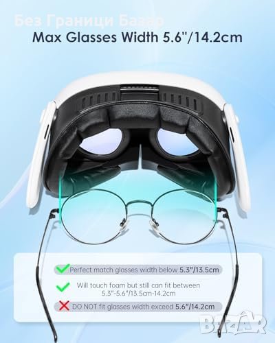 Съвместимост с очила: Подходящ за очила с ширина до 5.3"/13.5см, възможност за ползване и с очила между 5.3"-5.6"/13.5см-14.2см.