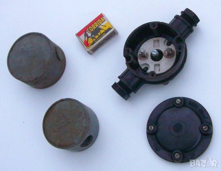 Разпределителна КОНЗОЛА (конзолна кутия за вграждане): Ø72 x Височина 42 мм, 1+4 входа (Ø20 мм), ~220V; От 1950-те години, с маркировка БрЙо БП.