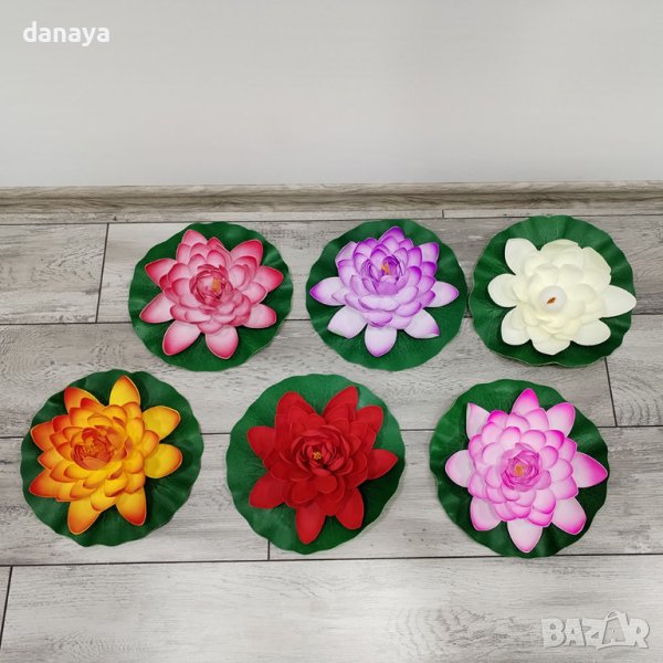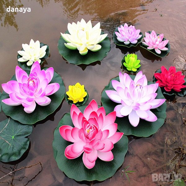 водни лилии за декориране – красива декорация за градината. Всяка изкуствена водна лилия е изработена от мек, гъвкав издръжлив материал, от PE пяна и има пръстен на гърба, за да се закрепи към низ. Може да се добави тежест, за да стоят на желаното място.