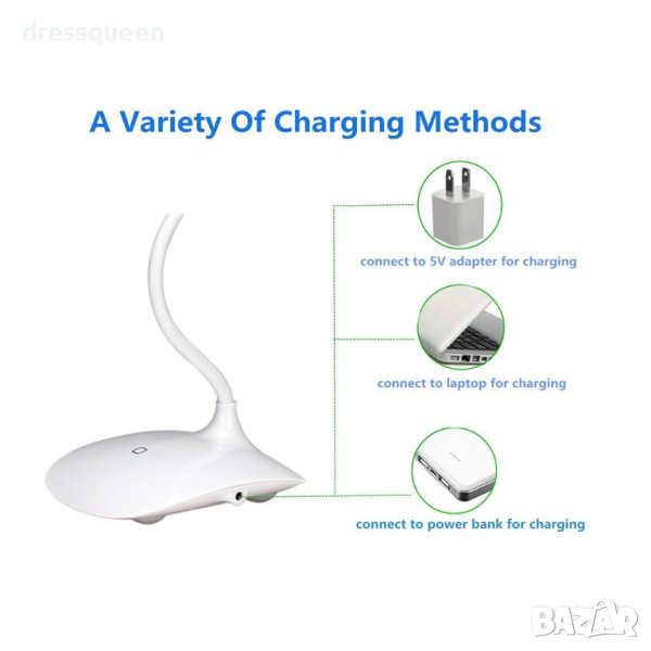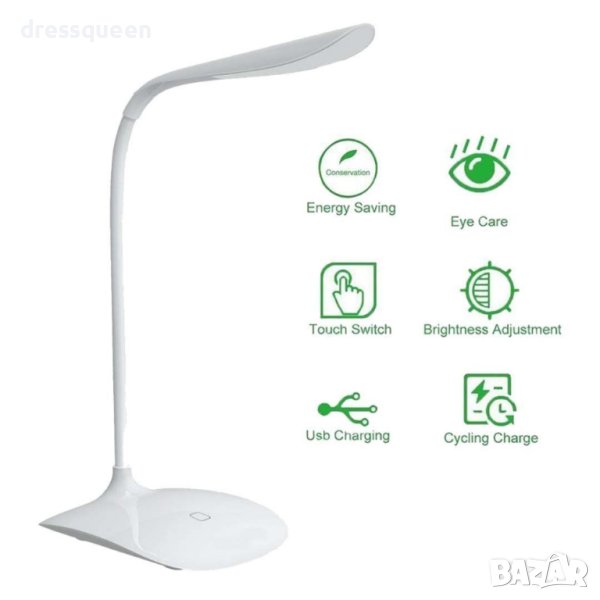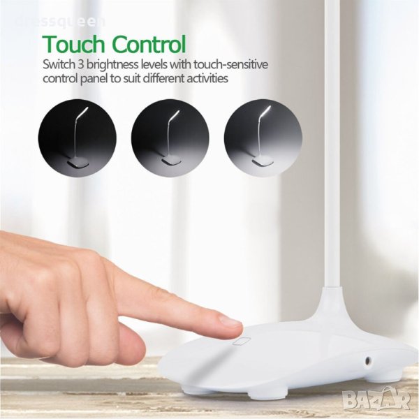 Лампата има вграден, тъч бутон със сензор реагиращ при докосване и 3 степени на работа. Снабдена е с гъвкава стойка, която може да нагласите, както ви е удобно. Горната част на лампата е въртяща се на 360 градуса.