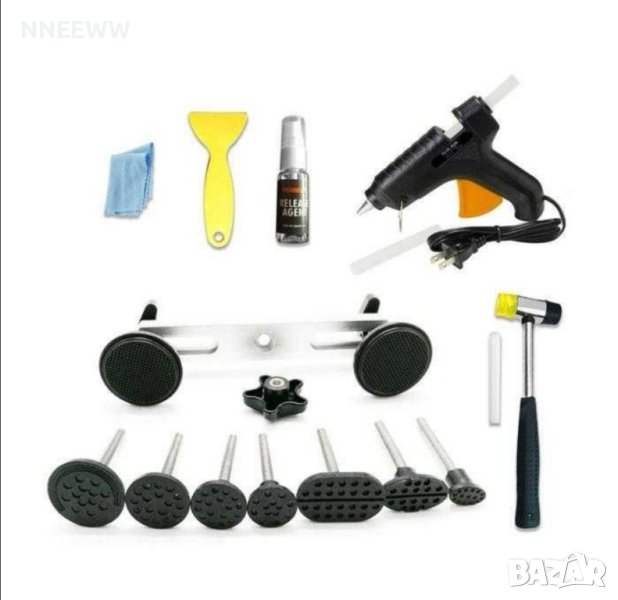 КОМПЛЕКТ ЗА ВЪЗСТАНОВЯВАНЕ НА ВДЛЪБНАТИНИ ПО КУПЕТО НА МПСКомплектът е подходящ за изчистване на следи от малки вдлъбнатини, без риск от повреда по купето и боята.Комплектът съдържа:Пистолет за топъл силиконОбратен чукСиликонови пръчкиИздърпваща пастаПодложки за издърпванеСтъргалка/пресаПочистващ агентНакрайник за подложкитеПреход за свързване на подложките с обратния чук.