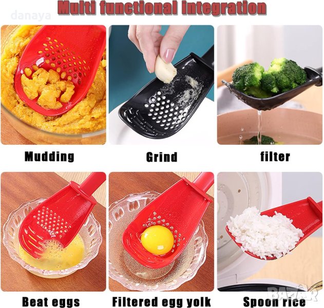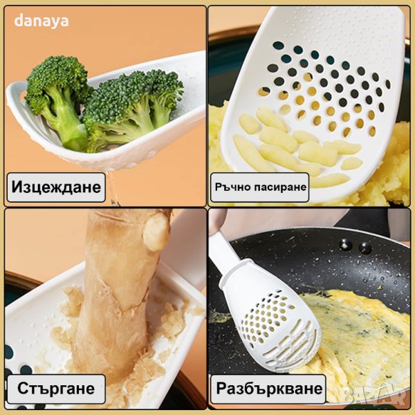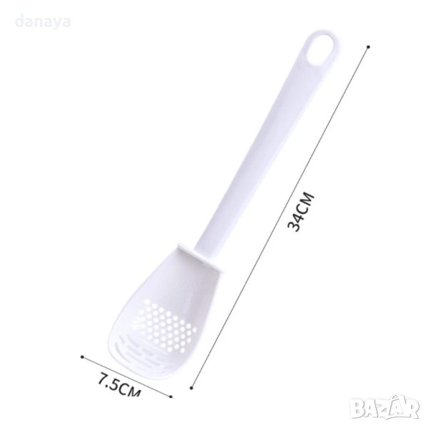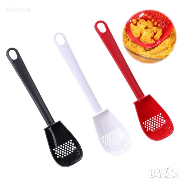Мултифункционален кухненски прибор за готвене. С тази решетъчна лъжица може да отцеждате, мачкате сварените храни на пюре, да стържете чесън, да разбърквате ястието, да разбивате яйца и още! Дългата дръжка е чудесна при работа с горещи храни. Този кухненски прибор може да се използва и като лъжица за ориз и други варива.