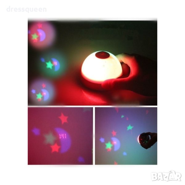 Магически часовник-лампа с аларма проектиращ звезди и час е уникален подарък за всеки и всякаква възраст! Тази нощна лампа с часовник и с аларма ще проектира многоцветни звезди и час на стената или тавана, а освен това има малък LCD екран и може да показва часа. Превърнете стаята си в романтично и спокойно място за отдих и релаксиращ сън, почувствайте се като в приказка! Просто го натиснете и ще проектира часа на стената или тавана в тъмната стая и часа ще изчезне само след 30 секунди!