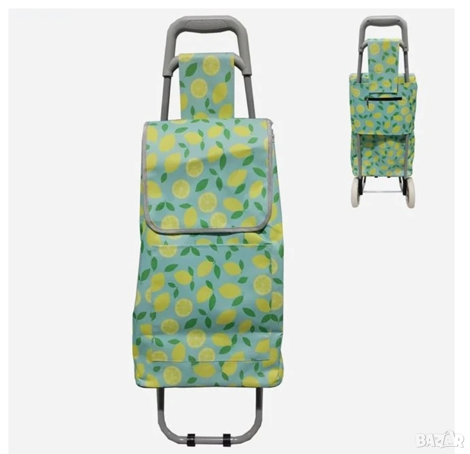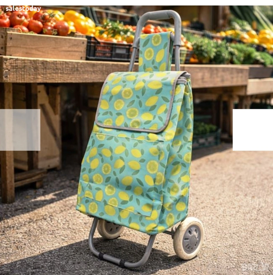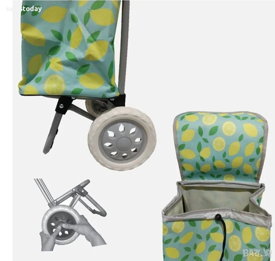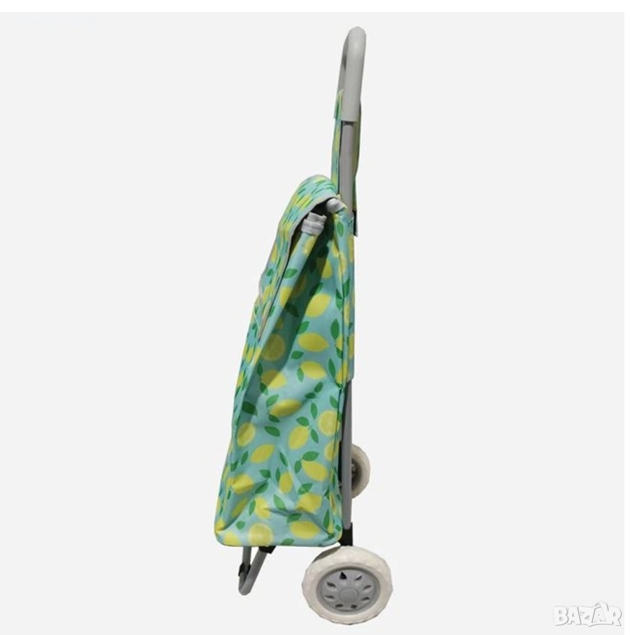 Сгъваема количка зелена с дизайн лимони за лесно пренасяне и съхранение при пазаруване. Изработена от плат полиестер 600D, има здрава конструкция, PVC подплата и метална рамка. Големите EVA колела я правят лесна за пренасяне. Затваря се с връзка и капак, а дръжката има мека подплата, за да не се хлъзга и да не се поти ръката ви. Почиства се лесно с влажна кърпа.