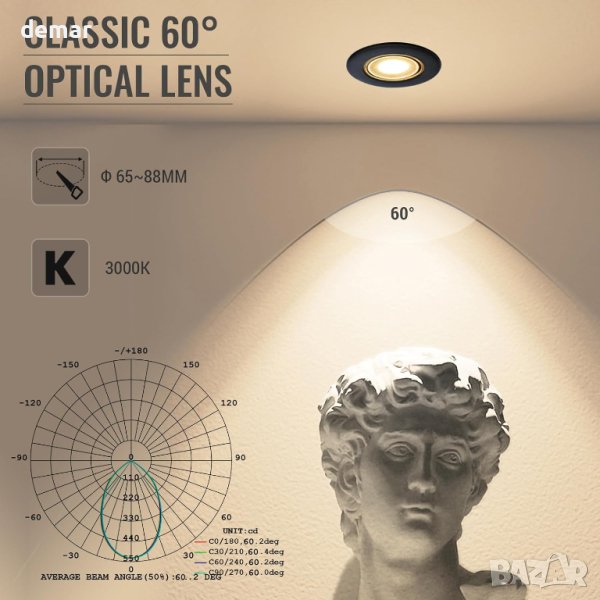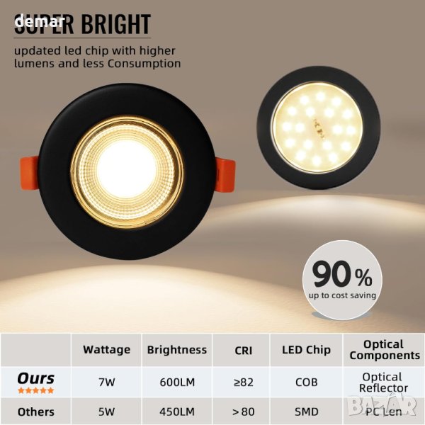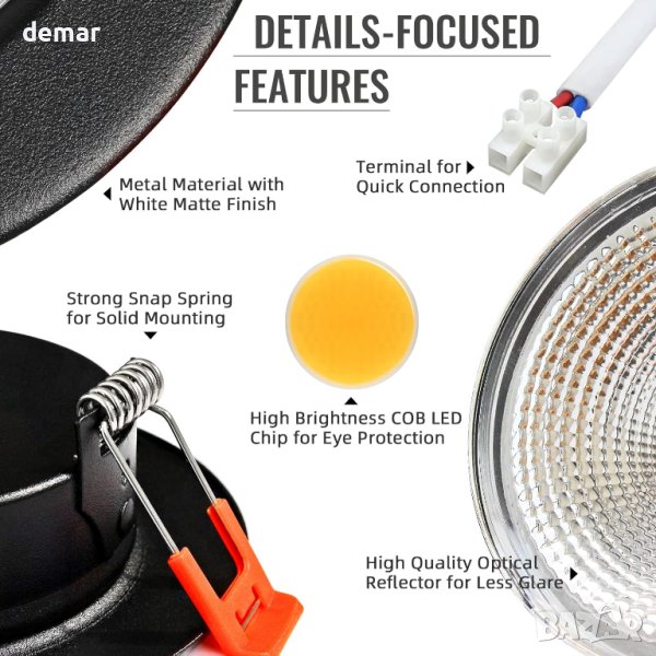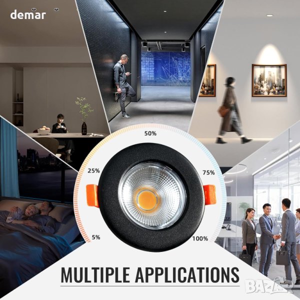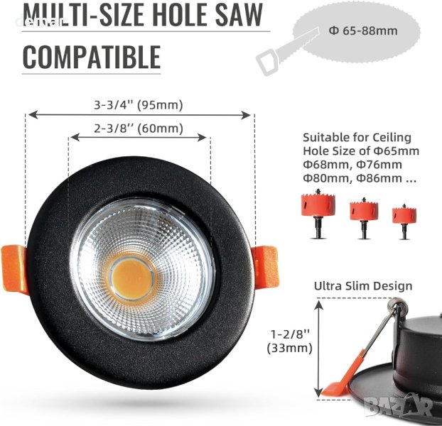 Тези 95-милиметрови LED прожектори за вграждане разполагат с дизайн на интегриран чип COB, осигуряващ 600 LM топло бяло (3000 K) яркост, еквивалентно на 70 W халогенна лампа, с висок CRI от 82+. Те предлагат тесен ъгъл на лъча от 60° за фокусирано осветление. Тези димируеми 240V LED таванни прожектори са съвместими с димери, осигуряващи затъмняване без трептене от 0% до 100%. Те използват висококачествени 60° оптични рефлекторни лещи за щадящо очите осветление без отблясъци. Със стилен ултратънък дизайн (33 mm дълбочина, 95 mm диаметър), те изискват отвори в тавана Ø65-88 mm и не се нуждаят от трансформатор. Тези икономични LED осветителни тела са енергийно ефективни, като предлагат до 90% икономия на енергия, което ги прави идеални за жилищни и търговски помещения като всекидневни, офиси, магазини, барове, кафенета, галерии, хотели и др.