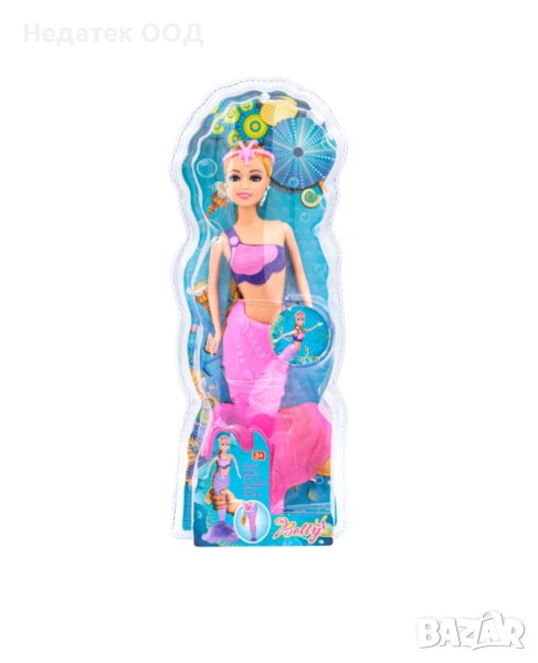 Кукла (33 см) русалка, която сменя цвета си. Поставете опашката на русалката в студена вода (17°-27°C) и тя ще стане лилава. Поставете опашката в топла вода (28°-38°C) и тя ще стане от лилава в розова.