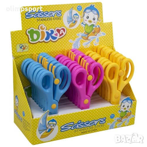 Ножица , 5.3 инча, 13.5 см. нова Разполага с връщаща пластина, осигуряваща автоматично разтваряне на острието. Подходяща за употреба у дома, в офиса, в училища и детски градини. Цвят - различни цветове. Материал - пластмаса. Дължина - 5.3 инча, 13.5 см. Тегло за един брой - 20 г. Бройки в кутия – 24. Тегло за кутия – 550 г. Размери кутия – 21х14х9 см