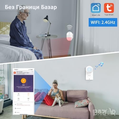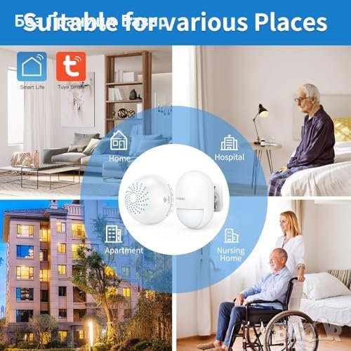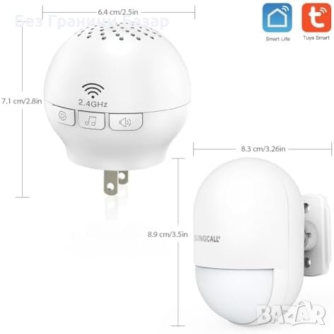 Висока сигурност: Обхват на комуникация до 100м, детектиране на движение в радиус 4-8м с ъгъл 110 градуса. Силна аларма 115db или режим на звънене.