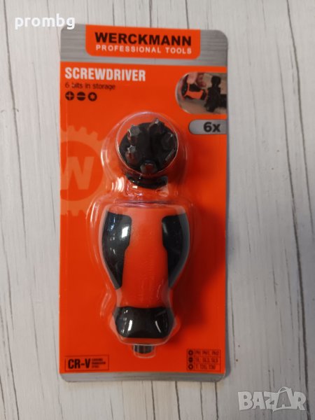 къса отвертка с 6 бита, Werckmann, внос от Белгия. Съдържание: права SL: SL3, SL5, кръстата PH: PH1, PH2, Torx T: T20, T30. мтериал: хром -ванадиева стомана.
