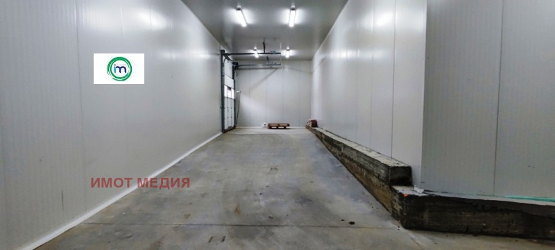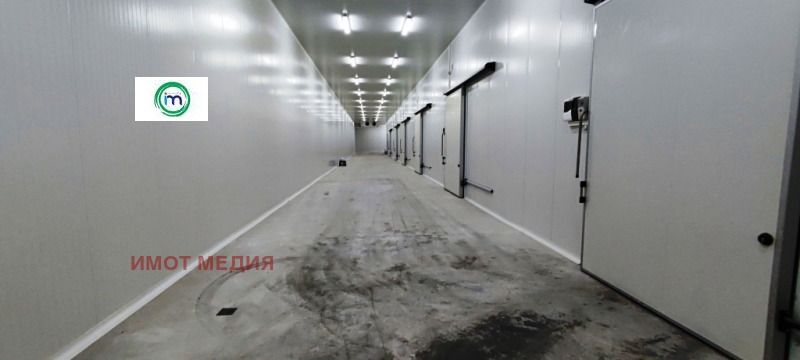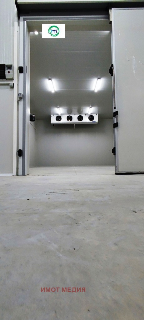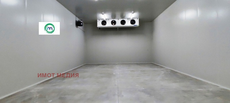 Агенция за недвижими имоти 'Имот Медия' Предлага хладилен склад в близост до АМ Тракия - 89км. от гр. София, 63км. гр. Пловдив, 300км. от гр. Бургас, с обща площ 1500кв.м., разполага с четири броя малки камери с кубатура от 388 куб.м. и два броя големи камери с кубатура 532 куб.м., камерите заемат половината пространство от общата сграда и могат да подържат до минус 30 градуса по целзий, останалата част от сградата може да подържа между 3 градуса и 5 градуса по целзий. Изградена мониторинг система, овлажняваща система, видеонаблюдение, две тир рампи за товаро - разтоварване. Може да се наемат отделни камери като малките са с наемна цена 4000лв. без ДДС и големите 5500 лв. без ДДС. Обявената наемна цена за цялата сграда 20 000 лв без ДДС.