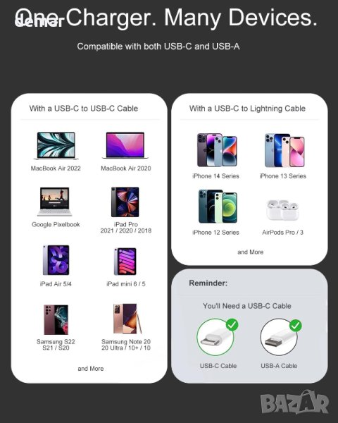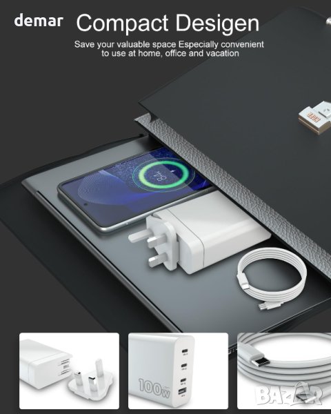 100 W USB C зарядно устройство с 3 USB-C порта и 1 USB-A порт, способно да зарежда до 4 устройства едновременно. То е многофункционално, идеално за употреба в дома, офиса или при пътуване и е с 40% по-малко от 96W зарядното за MacBook Pro. Това зарядно устройство може да се похвали с широка съвместимост с различни устройства, включително MacBook, Samsung Galaxy, Dell XPS, iPhone, iPad, Pixel и др. То използва GaN технология за компактност, ефективност и разсейване на топлината, гарантирайки безопасността на устройството. Преносимият дизайн ви позволява да носите едно зарядно устройство за всичките си електронни устройства, а пакетът включва 100W USB-C GaN зарядно устройство, 100W/1,8M USB-C към USB-C кабел и ръководство за добре дошли за ваше удобство.
