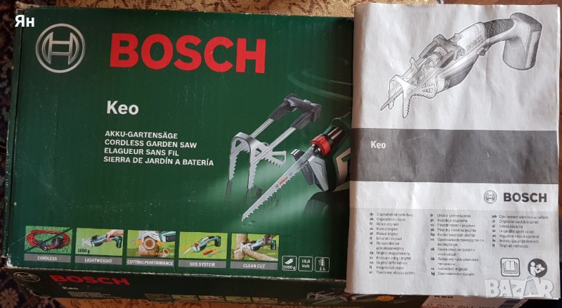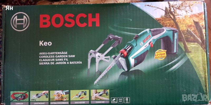 Акумулаторен градински трион Bosch KEO притежава 10.8 V Li-Ion батерия и има дължина на режещия инструмент 15 см. Реже без усилие дори дебели клони. Вградената литиево-йонна акумулаторна батерия осигурява голяма мощност. Тя е без саморазреждане и без Memory-ефект. Ръкохватката е с меко покритие и ергономична форма за увеличена маневреност. Трионът поддържа лесна смяна на ножа и е подходящ за различни задачи при рязане в градината. Разполага с авариен стоп и защита за ръцете за по-голяма безопасност. Свалящата се затворена ръкохватка „A-Grip“ гарантира по-добро рязане на свободно висящи клони. Блокировката осигурява безопасност, като предотвратява неволното включване. Ножът е с швейцарско качество за точни и чисти срезове до 80 мм (при свалена затворена ръкохватка „A-Grip“).