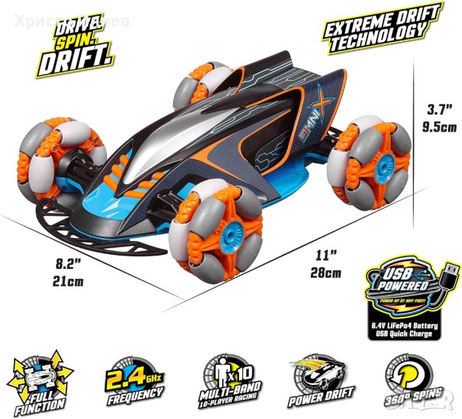 Състезавайте се с приятели и спечелете уверено с Omni X! Уникалното колело в конструкцията на колелото дава на карането и дрифта изцяло ново измерение, каквото не сте изпитвали досега! Всяко колело има 8 малки въртящи се части вътре, които ви позволяват да извършвате екстремни дрифтове и завъртания. Дистанционното управление осигурява лесна работа и в допълнение към традиционните контроли предлага 3 директно достъпни бутона за действие за още по-специални действия.