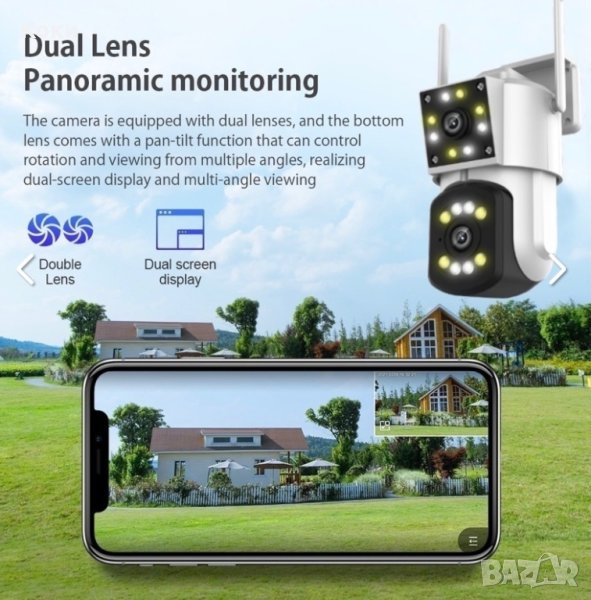 Външна двойна двуобективна PTZ камера за видеонаблюдение, която работи както на закрито, така и на открито при всякакви метеорологични условия, както и през нощта. Камерата поддържа WI-FI 2.4 GHz и има ъгъл на завъртане от 355 градуса. Той записва цялата заснета информация на карта с памет и записва активността в зоната за гледане с помощта на сензор за движение, който изпраща аларма до вашия смартфон. Освен това можете не само да виждате хора, но и да говорите с тях чрез двупосочна комуникация, което ви позволява да използвате камерата като домофон. Wifi камерата за видеонаблюдение е с прахо и водоустойчив корпус, остава работоспособна при температури на въздуха от -35 до +55 градуса и работи с приложението ICam365.