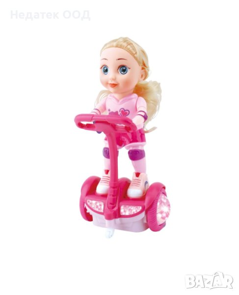 Кукла с дълга руса коса и розови дрехи в цвят фуксия на ролкови кънки, които се въртят на 360º, имат цветни светлини отпред и колела и музика.Куклата носи предпазна екипировка на лактите и коленете.Работи с 3 AA батерии (не са включени).
