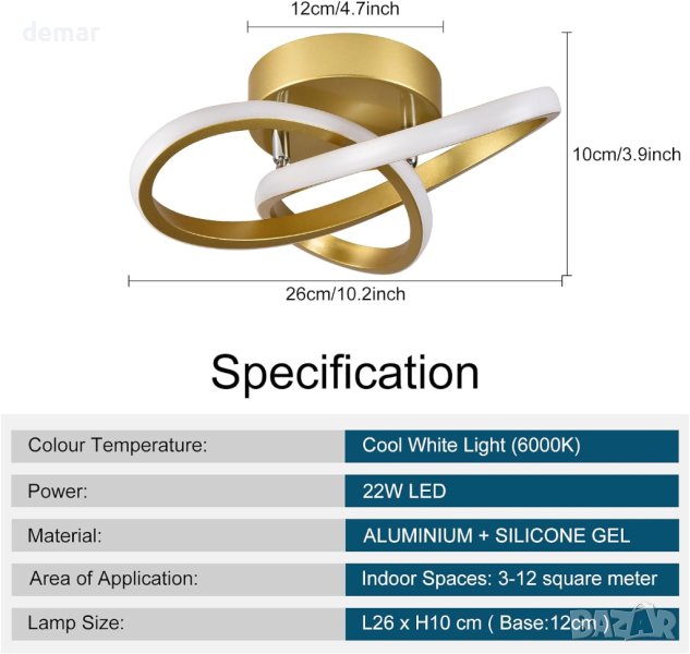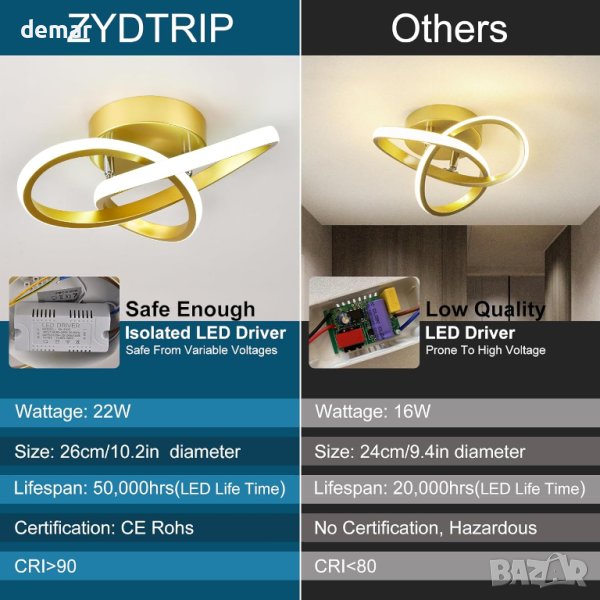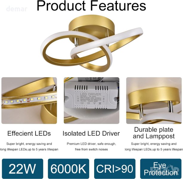 Модерната LED таванна лампа ZYDTRIP се отличава с иновативен дизайн на цветя в елегантно златно покритие, подходящо за различни стилове на домашен декор. Той разполага с безопасен изолиран LED драйвер, AC 85-265V вход и CE сертификат, гарантиращ безопасност и издръжливост. Алуминиевото метално тяло на лампата подобрява разсейването на топлината, удължавайки живота на светодиода. Тази енергийно ефективна светлина включва 22W, 6000k студен бял светодиод, предлагащ висока яркост, висок контраст (CRI > 90) и осветление без трептене. Проектиран е за до 85% спестяване на енергия и 5-годишен живот (50 000 часа), което значително намалява сметките за електричество. Освен това, той е лесен за инсталиране, с предварително сглобени фитинги и удобни за потребителя инструкции, и е с размер (W25,5cm x H12,5cm) за малки до средни стаи. Безопасността при инсталиране е подчертана с инструкция за прекъсване на захранването преди инсталиране.