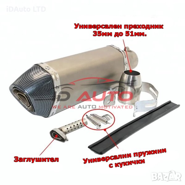 В комплекта ще откриете всичко необходимо за инсталация: гърне, заглушител, стикер, пружини и ушички за тяхното закрепване. Независимо дали сте опитен байкър или новак в мото света, този ауспух е идеалният избор за вас. Осигурете си качество, стил и уникален звук с "Универсален Ауспух за мотор - 370мм или 470мм " от ID AUTO!