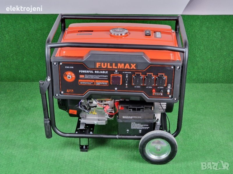 Новите 6.5 KW бензинови четиритактови генератори FULLMAX, за монофазен ток. ВГРАДЕНО АВТОМАТИЧНО ЗАРЯДНО ЗА АКУМУЛАТОРА. При нашите генератори автоматичното старт-стоп табло следи за нивото на заряд на акумулатора и при нужда го дозарежда до нужния заряд, за да може всеки път генератора да стартира безупречно. Когато генератора не е превключен на режим автоматика, паленето на генератора е с ключ, който е на управляващото табло. Генераторите са с медни ротори и статори. Бензинов Двигател VТR 800 с въздушно охлаждане, 16 конски сили. Работна честота: 50 Hz. Вграден AVR /Automatic Voltage Regullator/. Автоматичен предпазител против претоварване на генератора. Магнетен стартер и автостартер с ключ и акумулатор. Транспортна рамка с колела и дръжки за по-лесно предвижване на генератора. Генератора има вграден дигитален дисплей показващ изходящият моментен волтаж, херцовете и отработените моточасове. 3 броя изходи за 230 V и един изход за 12 V. Нивото на шума е 69-72 dB. Разход: 450 грама бензин на киловат час при пълно натоварване. Размерите му са: дължина 68 см., ширина 51 см. и височина 55 см. Тегло бруто с автоматиката 110 кг. Гаранционен и след гаранционен сервиз.