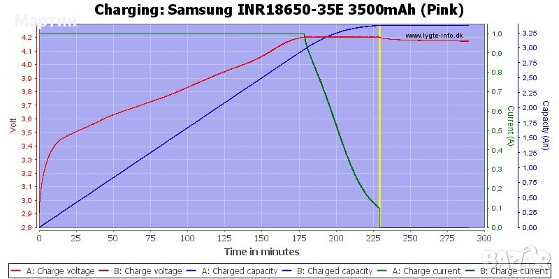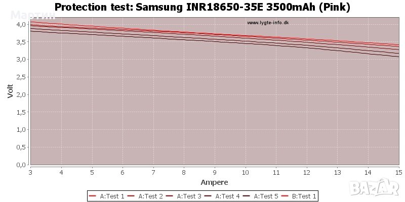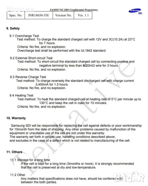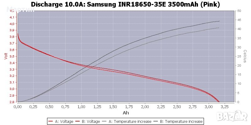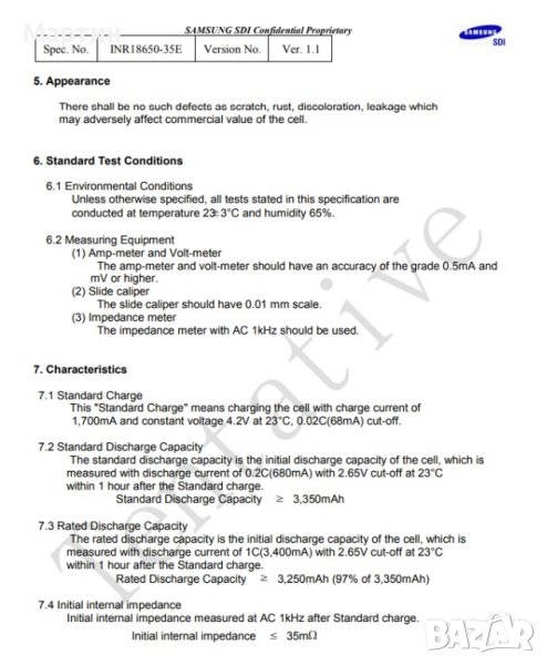 Литиево-йонна акумулаторна батерия модел Samsung 35E с капацитет 3500 mAh. Позволява разряд с ток до 10А. Изпълнение тип 'flat top' (равна площадка на положителния терминал).
