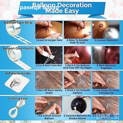 - Комплект за украса с балони: 10 части - 2х5м ленти за балони, 2х100 лепилни точки, 4 куки, 2х10ft влакно