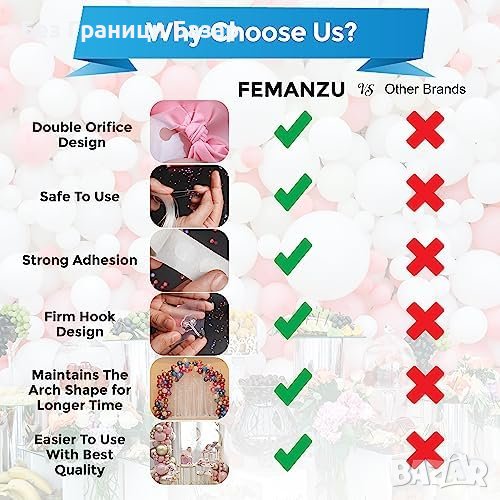 - Лесна инсталация: интуитивни ленти с два размера отвори за бързо и сигурно закрепване на балоните