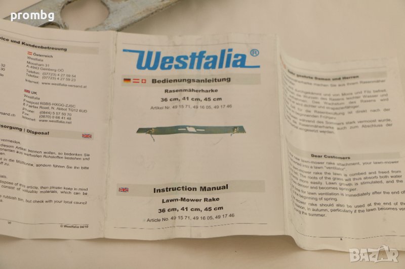 нож, перка за косачка, 36 см, нов, Westfalia- Германия. Благодарение на центробежната сила, косачката коси и аерира/вентилира едновременно при косене. Подходяща за всички сърповидни/ротационни косачки (с изключение на косачки с въздушна възглавница), поради включените редуциращи дискове. Диаметърът на отвора е 22 мм. Съвместим само с бензинови косачки.